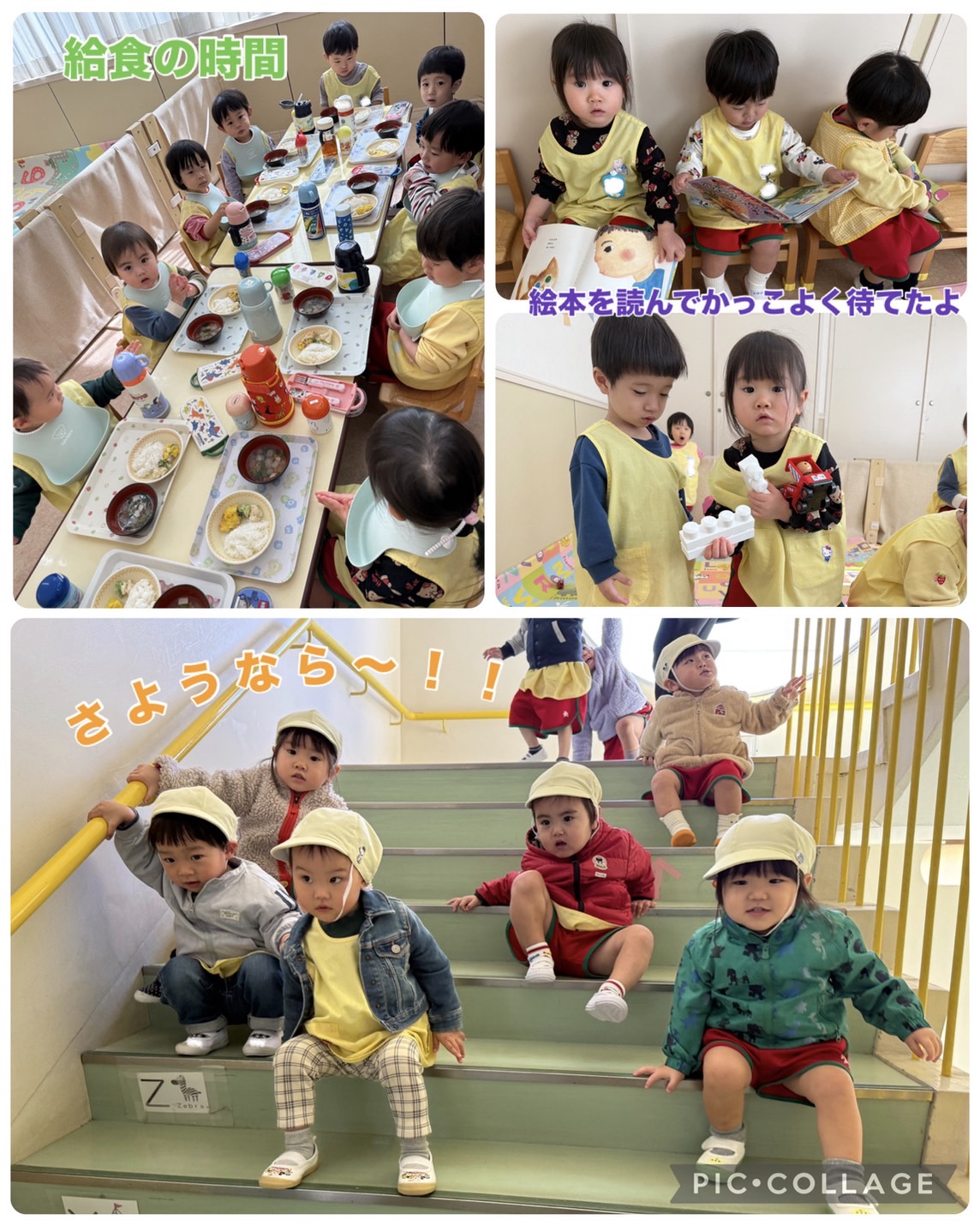 大好きな給食!いっぱい食べた後は、椅子に座って絵本を読みます。上手に待てるようになりました。帰りは、階段を座っております。「おしり、あし」と声をかけながら、大好きなお家の人まであと少し、上手に降りるたんぽぽ組さんでした。