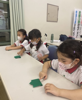 2022.07.21 年長 5.折り紙製作(かえる) 雨が少し降ってきた為、残念ながら水遊びではなく代わりに折り紙製作しました⭐︎今から何を作るんだろう?ワクワクしています⭐︎ピンク、水色、黄緑、緑色の折り紙が出てきましたね!説明を聞いて折っていく目が真剣です。さぁ、折り紙で何が完成したでしょう〜?なんと!かえるさんが完成しました〜!お尻をぴょんっと押してかけっこ競争したりして楽しみました♪次は何をするのかな〜?次の投稿を、お楽しみに月組担任 前の記事 すべての一覧へ戻る 次の記事